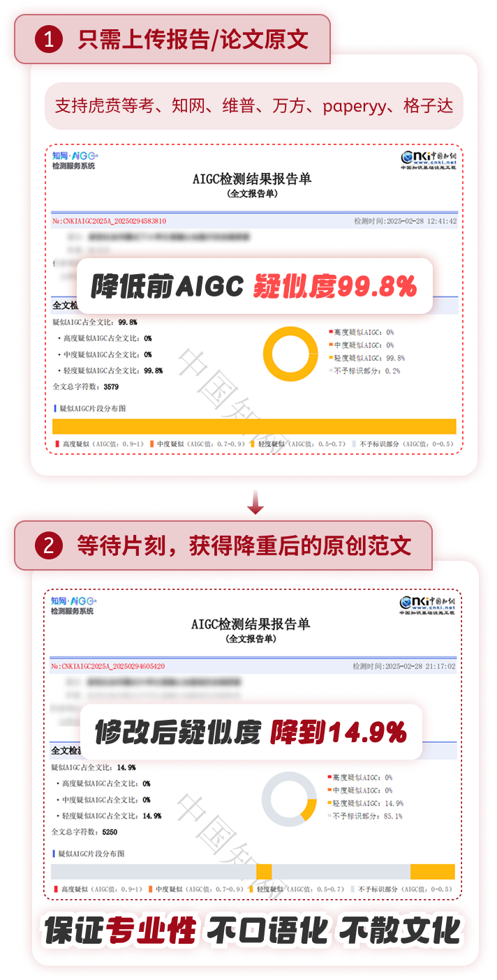 全新升级!适配知网/维普最新AIGC(知网2.13严苛版,维普2.26严苛版),深度优化文本结构,减少AI生成痕迹。